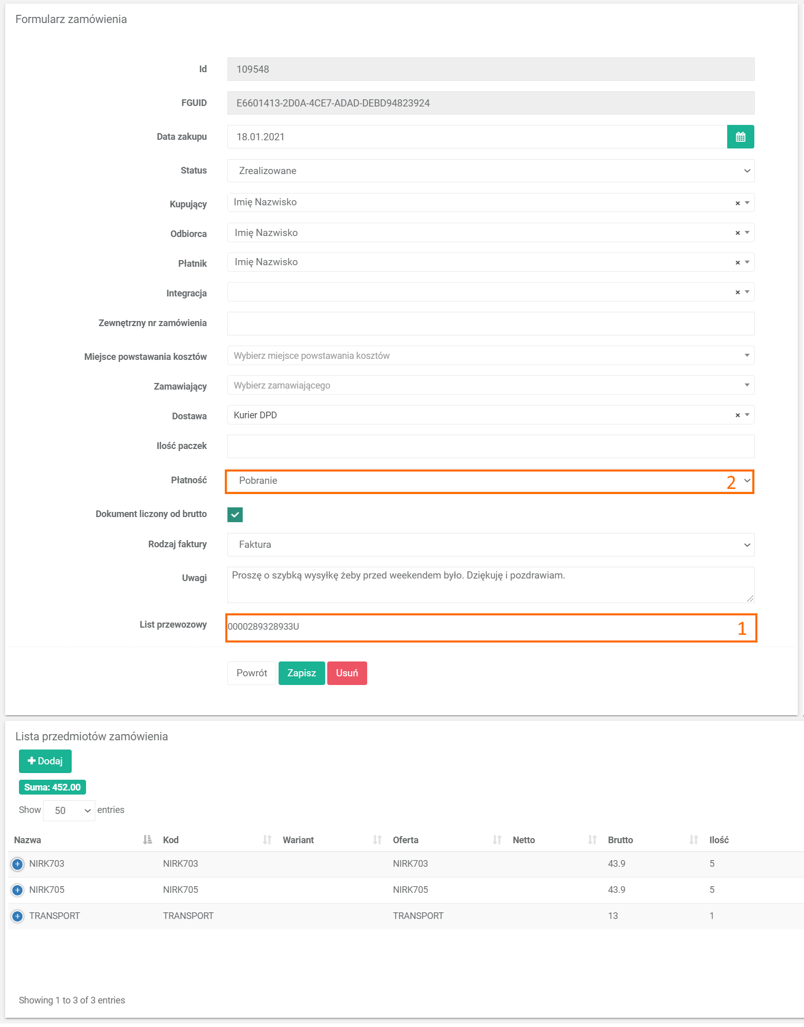 | Formularz zamówienia > Formularz zamówienia | Płatność | 2 | Etykieta | Uwaga Pobranie!!! | 2 | Wynika z mapowania form płatności. Jeżeli na zamówieniu jest forma płatności zdefiniowana w integracji z kurierem jako forma COD, to na liście przewozowym jest zaznaczona opcja COD. |