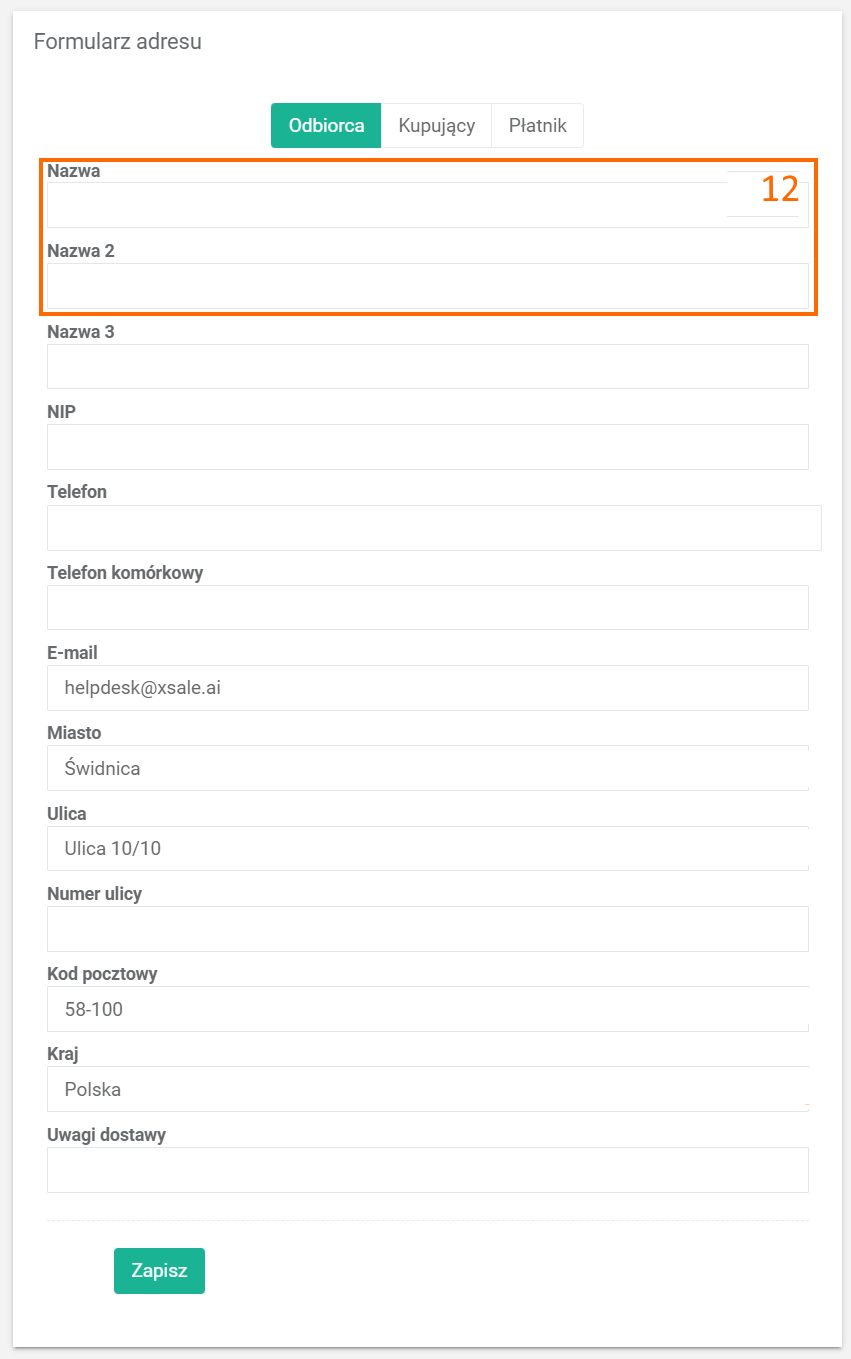 | Formularz zamówienia > Formularz adresu > Odbiorca | Nazwa i Nazwa 2 | 12 | Odbiorca | Odbiorca | 12 | Jeżeli Nazwa 2 jest pusta, to wartość pobierana jest tylko z pola Nazwa |