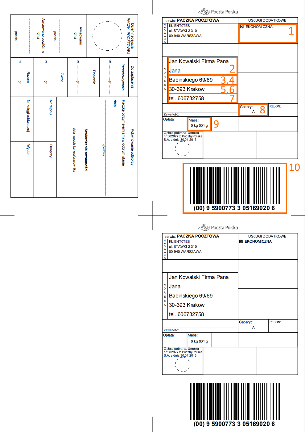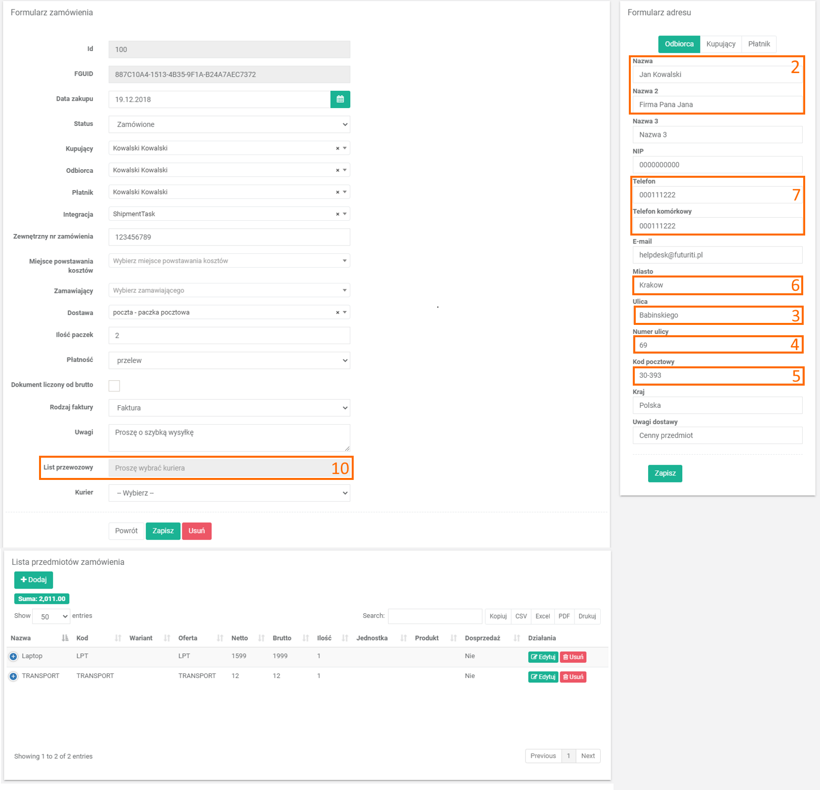 | Formularz zamówienia > Formularz adresu > Odbiorca | Telefon / Telefon komórkowy | 7 | Adresat | tel. | 7 | Jeśli „Telefon komórkowy” nie jest uzupełniony to brany jest „Telefon”. |