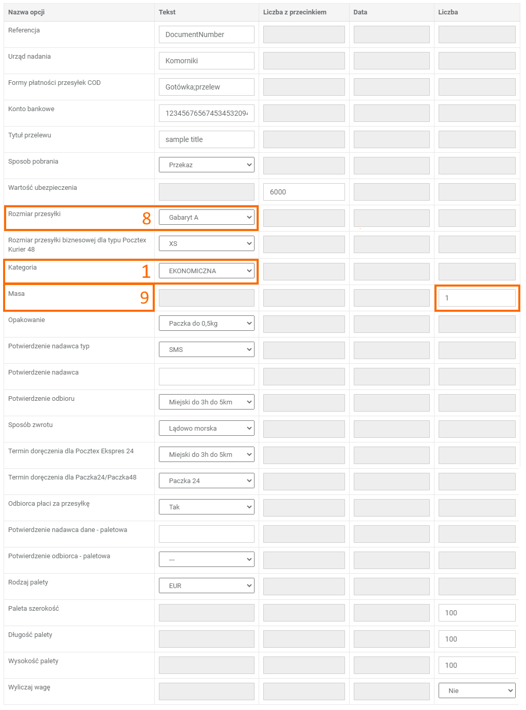 | ShipmentTask > Poczta Polska | Masa | 9 | Etykieta | Masa | 9 | Podana w gramach |