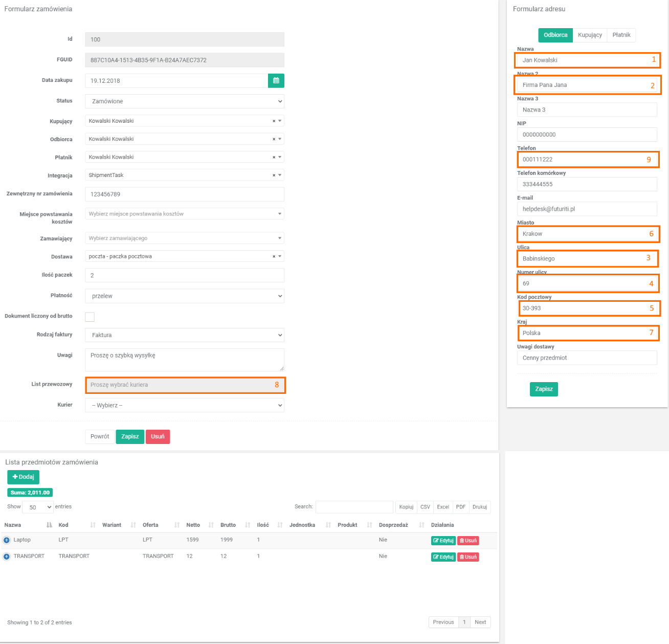 | Formularz zamówienia > Formularz adresu > Odbiorca | Telefon | 9 | Adresat | Telefon | 9 | Jeśli nie zostanie wskazany w tym polu, zostanie pobrany z kontrahenta. |
