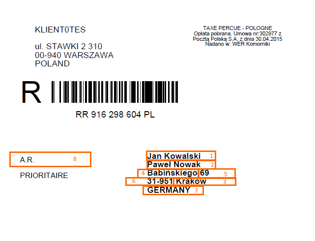 | Dane specyficzne > Formularz danych przesyłki> Usługi dodatkowe | Ilość potwierdzeń odbioru | 8 | Odbiorca | Etykieta | 8 | Na liście przewozowym pojawia się oznaczenie A.R |