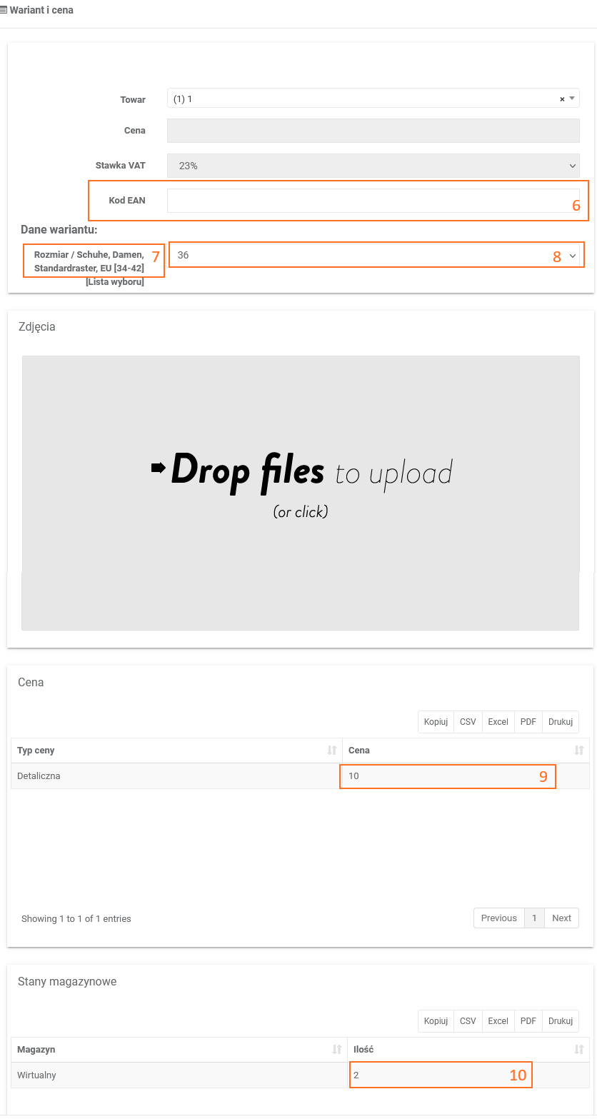 | Oferta -> Edycja -> Warianty i ceny -> Edytuj | Wartość pola Dane wariantu | 8 | Menu > Articles > Article Status Overview > Edit Article > Edit Article Variant | Size | 10 | |