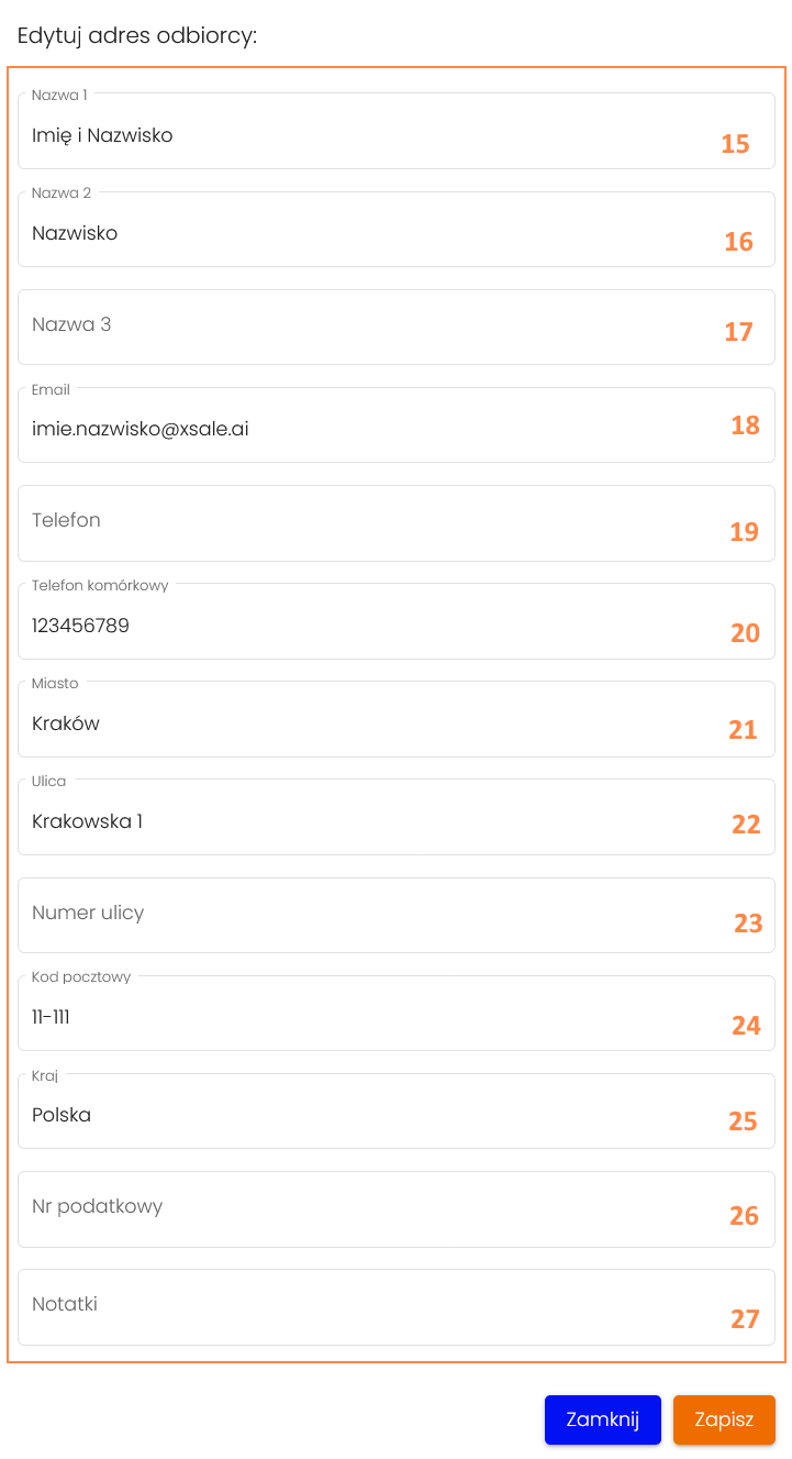 | Edycja zamówienia > Formularz adresu > Odbiorca | NIP | 18 | Lista zamówień > Operacje > Stwórz przesyłkę > Odbiorca > Edytuj adres odbiorcy | Nr podatkowy | 26 |